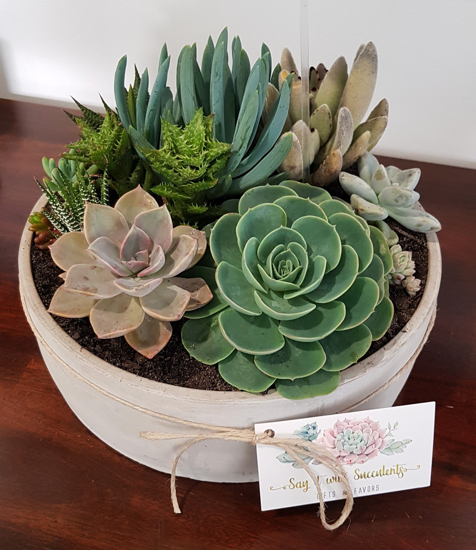 A large low pot full of a variety of succulents. A stunning centerpiece!