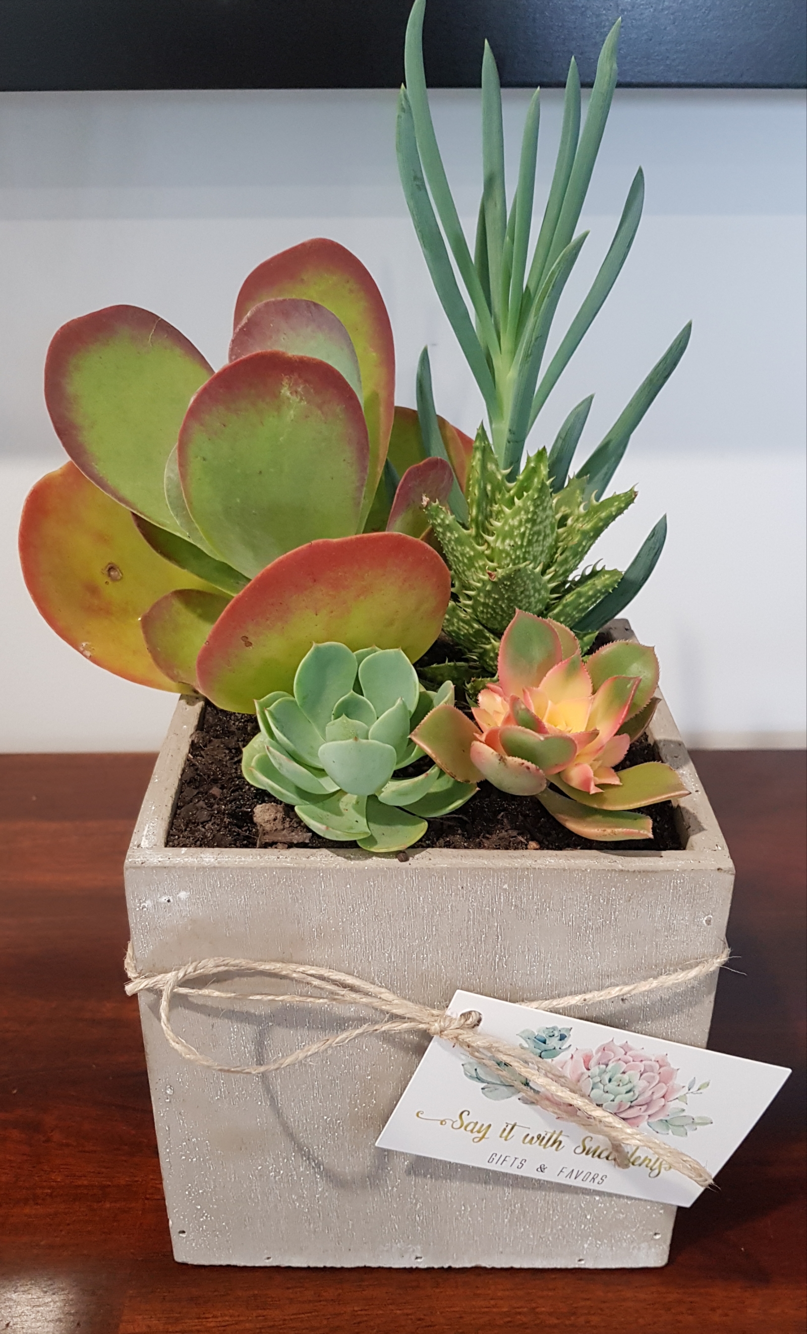 Home / Arrangements / Summer Summer$65.00 Beautiful and vibrant succulents in a square pot. This pot measures 14cm x 14cm x 14cm. Please note: Succulent varieties may vary to those shown in the photo. Out of stock Category: Arrangements Product ID: 1355 Related products Teacup pretties $60.00 Buy now The perfect pot $60.00 Buy now Pretty as a picture $65.00 Buy now